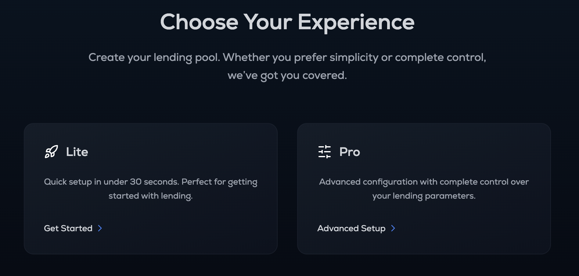 After selecting to create a lending pool, users must choose between two pool creation modes: [Lite](https://docs.rain.fi/earn/create-pool/lite) and [Pro](https://docs.rain.fi/earn/create-pool/pro). These modes offer different levels of customization and flexibility based on user requirements.